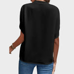 Modern kesimi ve sade şıklığıyla öne çıkan bu bluz, gardırobunuzun vazgeçilmezi olmaya aday. V yakalı ve zarif yaka detayıyla feminen bir duruş sunarken, özgürce hareket etmenizi sağlayan dökümlü kollarla rahatlık da garanti.