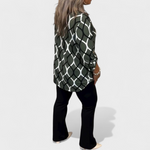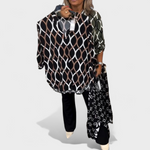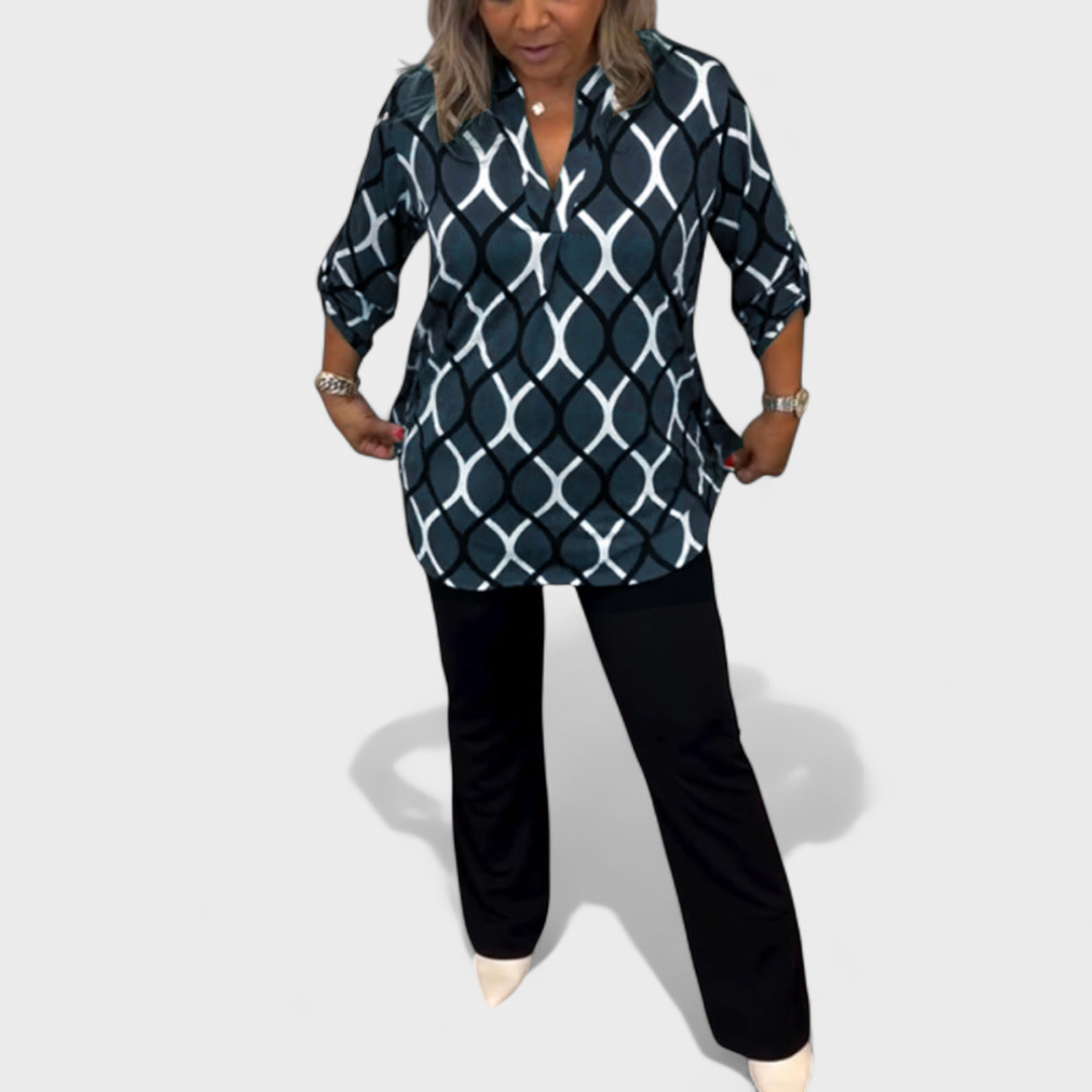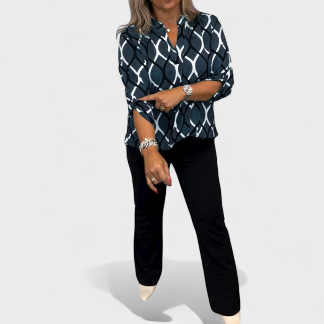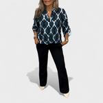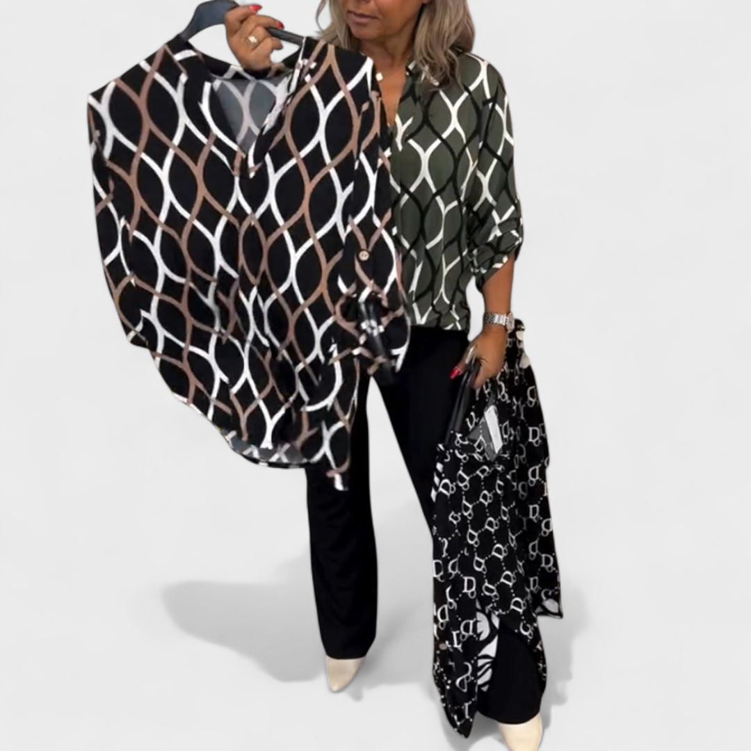 Bu takım, rahatlık ve zarafeti bir araya getirerek günlük yaşamda çok yönlülük arayanlar için mükemmel bir seçimdir. Modern desenli bluz ve şık pantolonun birleşimi, hem gündelik hem de daha resmi ortamlarda dengeli ve şık bir görünüm sunar.