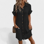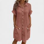Bu gömlek elbise, ferah ve rahat tasarımıyla sadelik ve işlevselliği bir araya getiriyor. Ön düğmeleri ve pratik cepleri sayesinde casual bir şıklık sunarken, rahat kesimi gün boyu konfor sağlıyor.