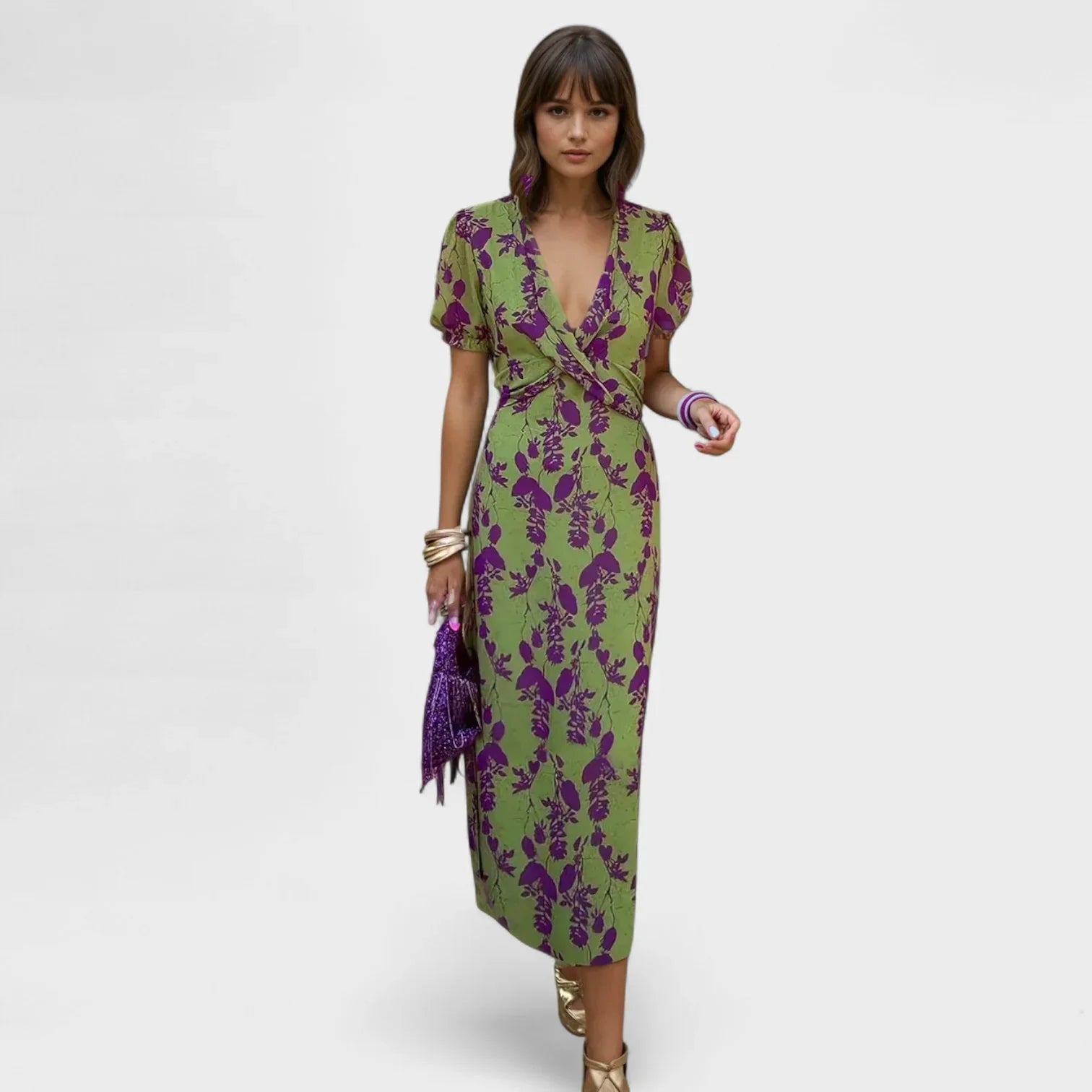 Bu elbise, zarafet ve kişiliğiyle öne çıkmak isteyen kadınlar için tasarlandı. Çapraz yaka detayı silueti zarifçe vurgularken, akıcı kesimi sofistike ve hafif bir görünüm kazandırır. Her ortamı parlayacağınız özel bir an haline getirir.