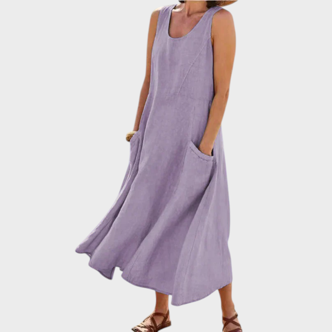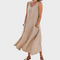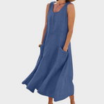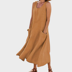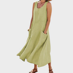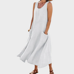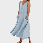 Bu uzun ve akıcı elbise, rahatlık ve şıklığı bir arada arayanlar için mükemmel bir seçimdir. Geniş askıları ve bol kesimiyle sıcak günlerde ferahlık sağlarken, özgürce hareket etme imkânı tanır.