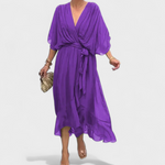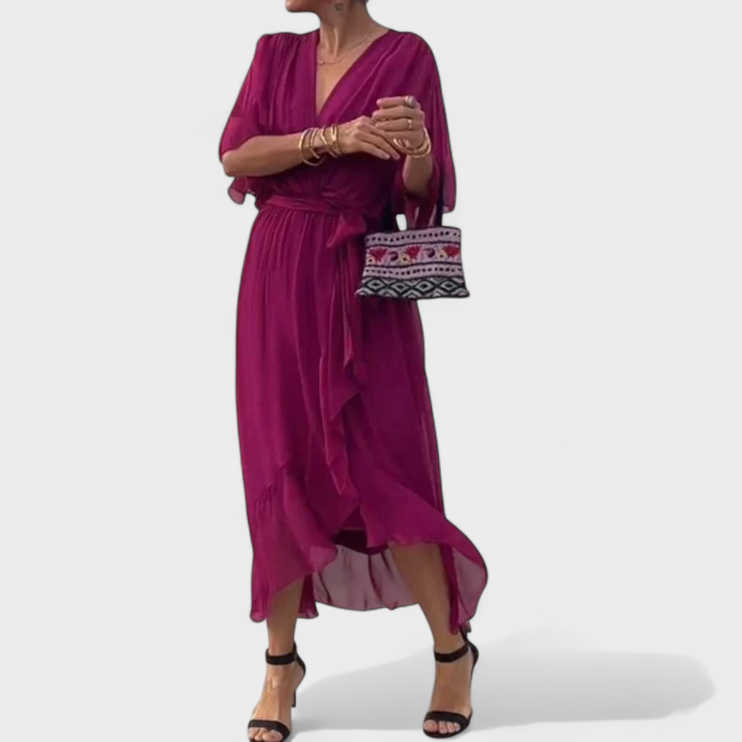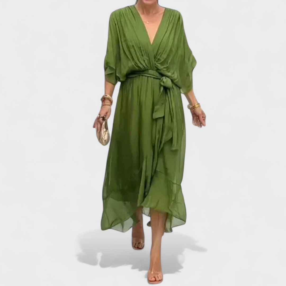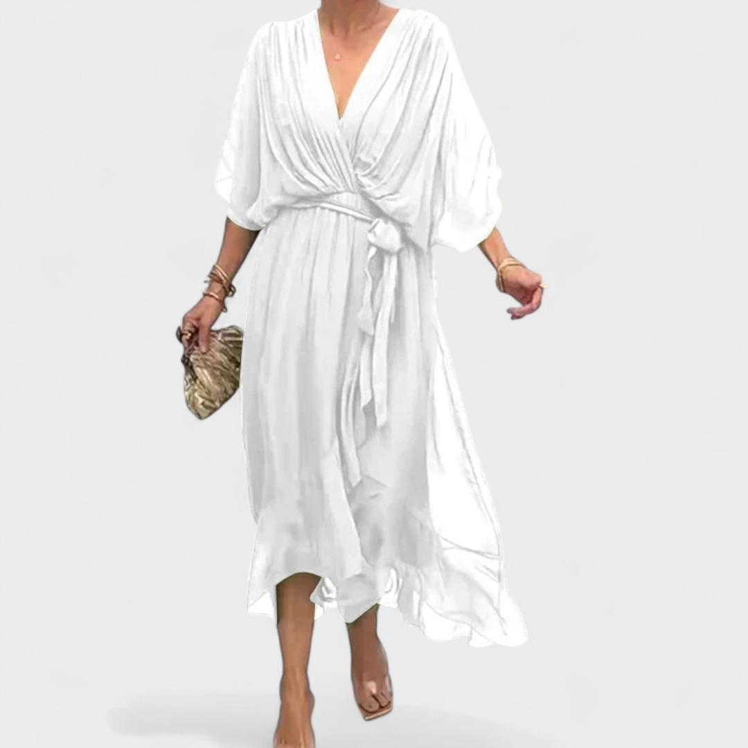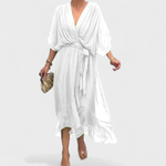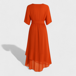 Bu elbise, şıklık ve konforun mükemmel birleşimidir. Akıcı kesimi ve zarif yakasıyla silueti doğal ve sofistike bir şekilde öne çıkarır. Beldeki fiyonk detayı feminen bir dokunuş katarken, hafif ve rahat tasarımı her ortamda zarif bir hareket sağlar.