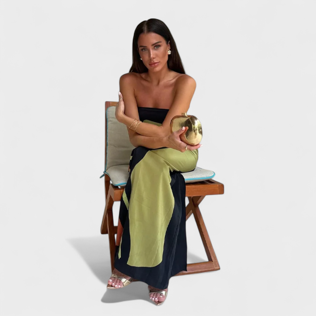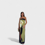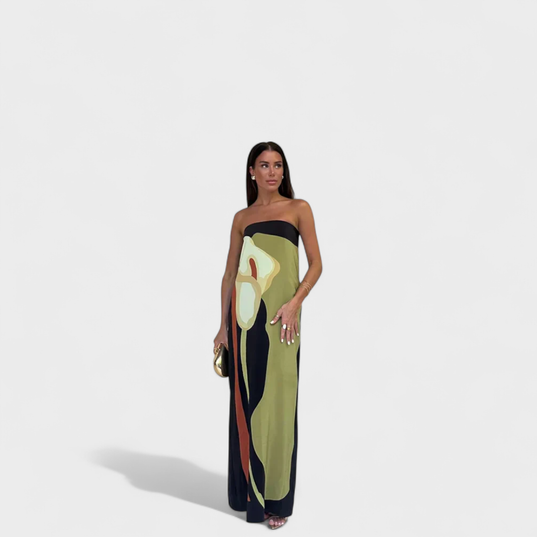 Bu askısız elbise, özgüven ve şıklıkla parlamak isteyen kadınlar için tasarlandı. Göğüs kısmındaki oturan kesimi silueti zarifçe öne çıkarırken, uzun ve akıcı tasarımı sofistike bir duruş kazandırır.