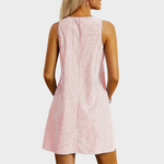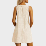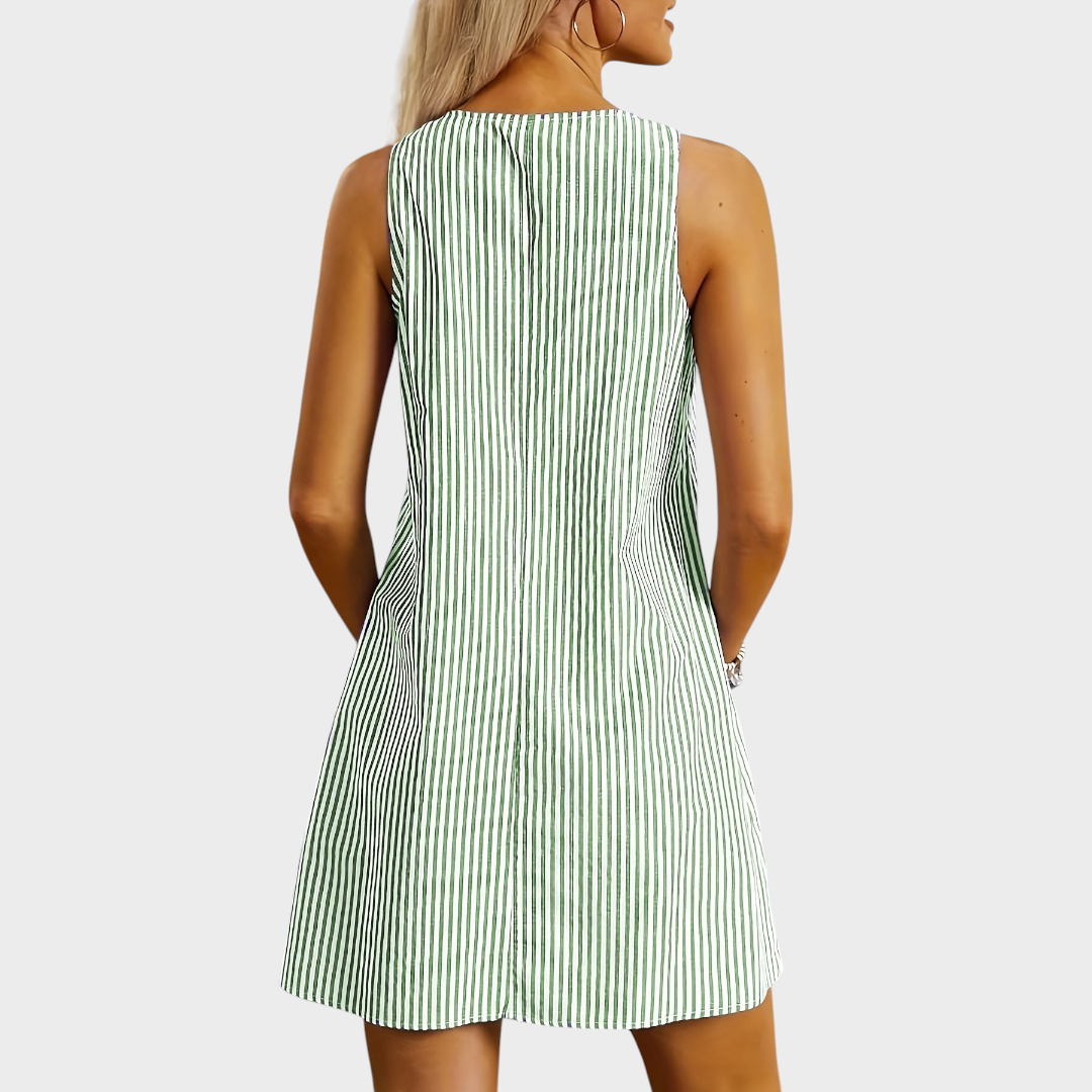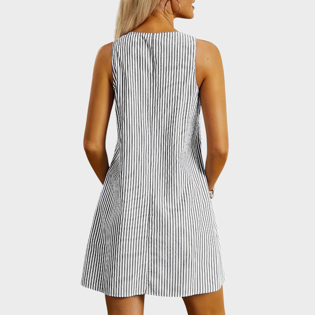 Askılı, çizgili desene sahip bu elbise sıcak yaz günleri için mükemmel bir seçimdir. Hafif ve salaş tasarımı konforu zarafetle birleştirirken, ön cepleri hem pratiklik hem de tarz katıyor.