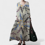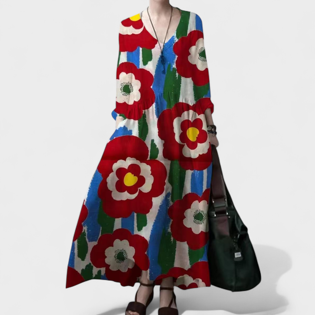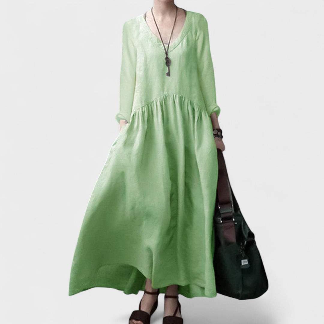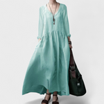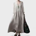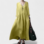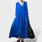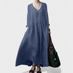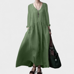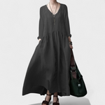 Bu uzun elbise, rahat ve akıcı kesimiyle siluetinizi zarif bir şekilde ön plana çıkarır. Uzun kolları ve V yakası, gündüzden geceye uzanan feminen ve çok yönlü bir hava katar. Rahatlığı ve şıklığı bir arada arayanlar için mükemmel olan bu parça, her duruma uyum sağlar.