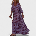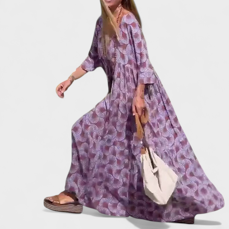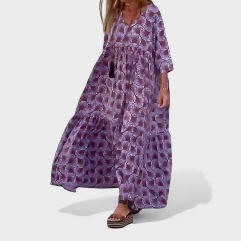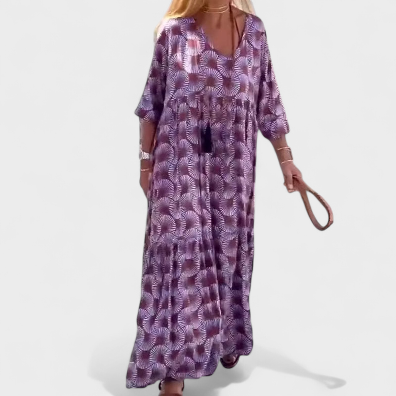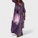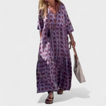 Bu uzun elbise, günlük yaşamda rahatlık ve şıklığı bir araya getirmek isteyenler için tasarlandı. Salaş ve akıcı kesimi ferahlık ve hareket özgürlüğü sunarken, özgün deseni tarzınıza kişilik ve çekicilik katar.