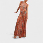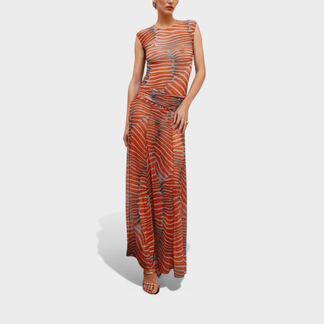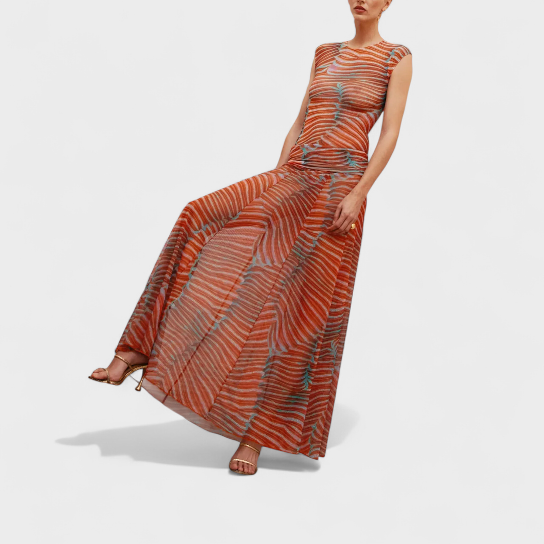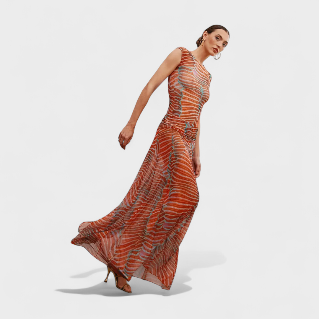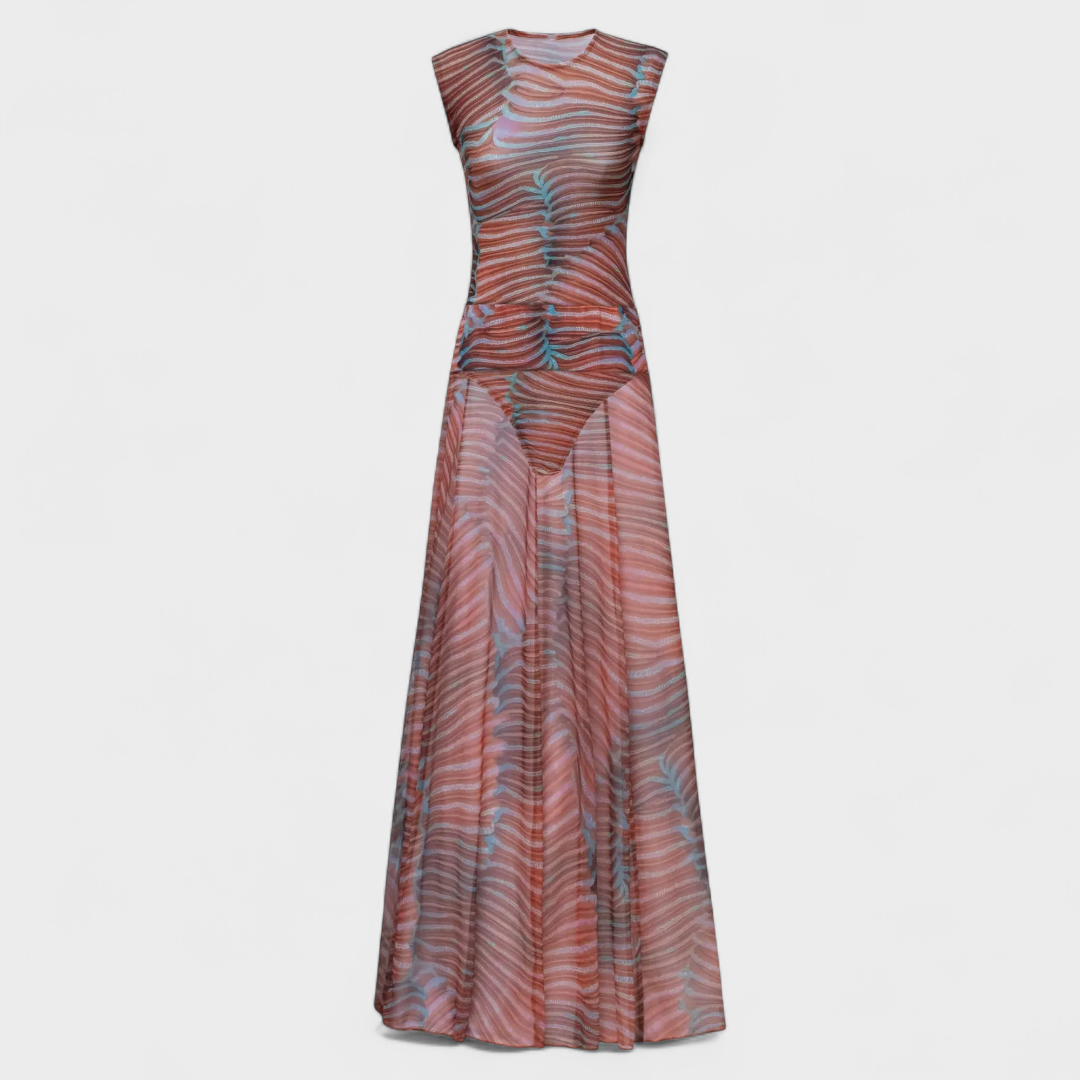 Kolsuz ve uzun kesimli bu elbise, modern ve dikkat çekici deseniyle zarafeti rahatlıkla birleştiriyor. Akıcı formu sayesinde hafiflik ve konfor sunar, silueti doğal bir şekilde ön plana çıkarır.