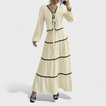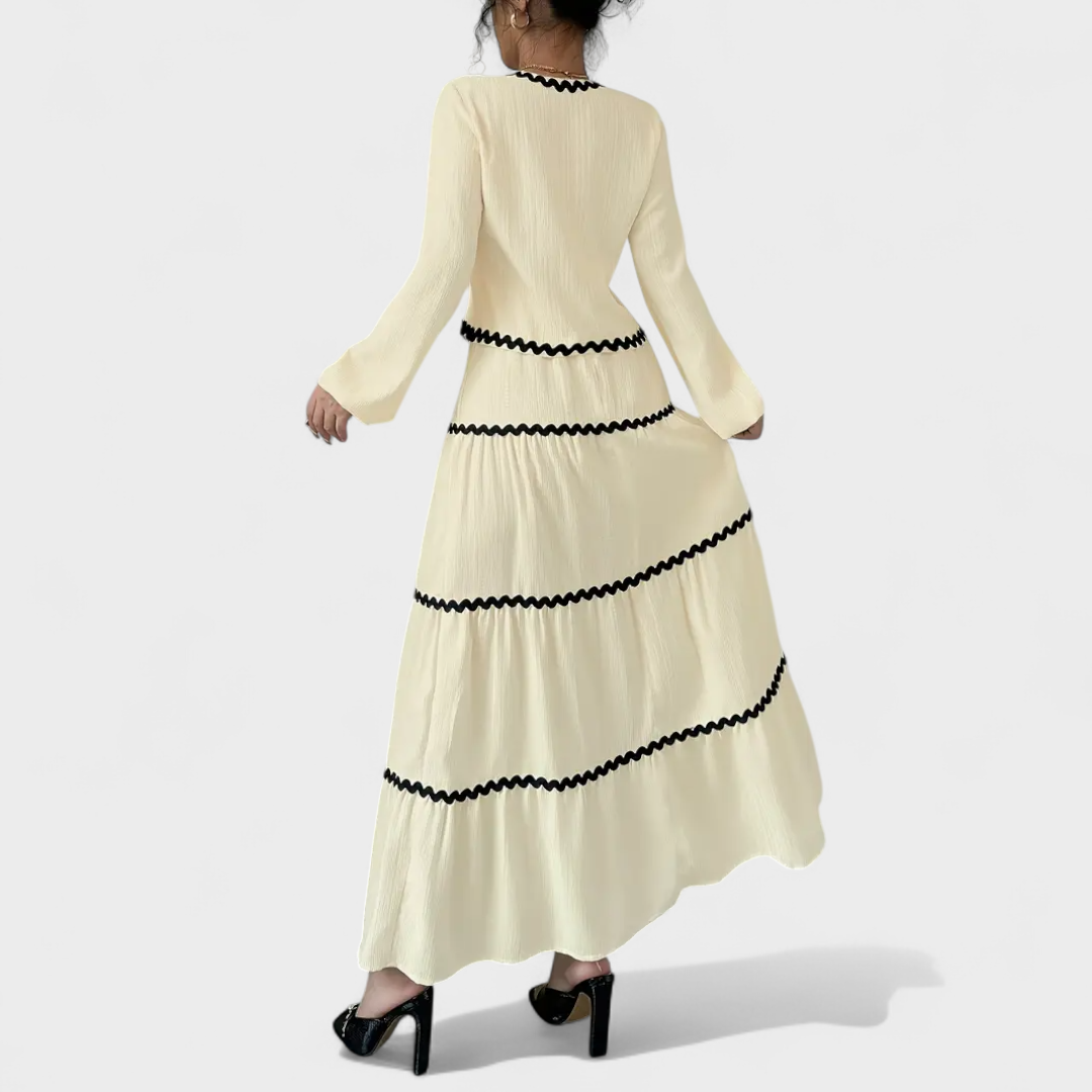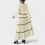 Bu elbise, zarif çizgileri modern dokunuşlarla buluşturuyor ve feminen, sofistike bir siluet sunuyor. Kontrast detaylar ve ayarlanabilir yaka kısmı sayesinde her ortamda şıklığınızı zahmetsizce ön plana çıkarır.