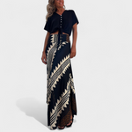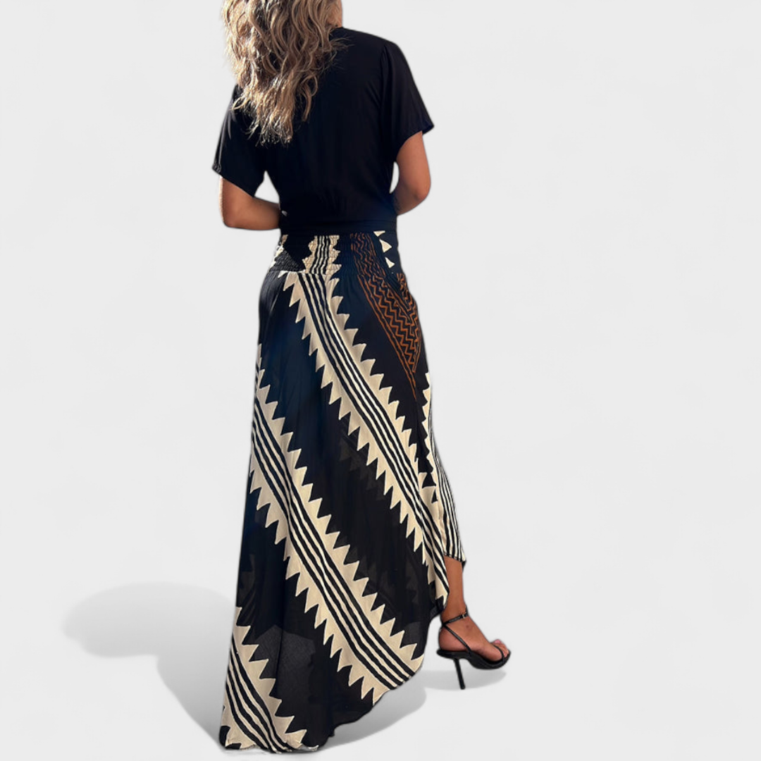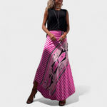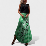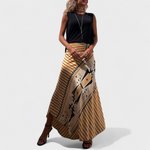 Bu uzun etek, şıklığı modern ve rahat bir tarzla buluşturmak isteyenler için ideal bir seçimdir. Akıcı tasarımı ve dikkat çekici deseni sayesinde hem günlük kombinlerde hem de özel anlarda kolayca kullanılabilir. Her detayıyla kişiliğinizi ve stilinizi yansıtan özel bir parçadır.