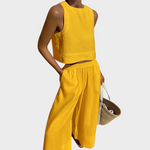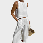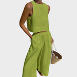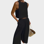 Kolsuz üst ve akıcı kesim pantolondan oluşan bu takım, rahatlık ile modernliği bir araya getirmek isteyenler için tasarlandı. Minimalist ve ferah tasarımı sayesinde hem günlük kullanımda hem de sade şıklığın ön planda olduğu anlarda ideal bir seçimdir.