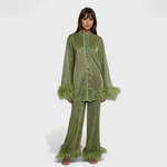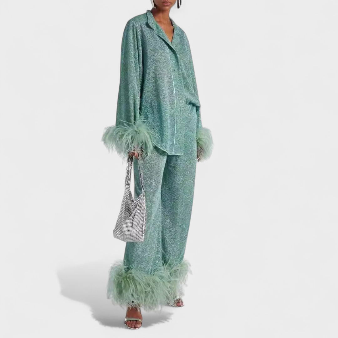 Bu takım, cesaret ve zarafeti bir arada seven kadınlar için tasarlandı. Tüy detayları, lüks ve özgün bir hava katarken; rahat kesimi her ortamda özgürlük ve şıklık sunar. Stil ile konforu mükemmel şekilde dengeleyen özel bir parçadır.