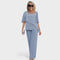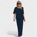 Bu açık mavi tonlarındaki zarif takım, hem konforu hem de şıklığı bir araya getiriyor. Asimetrik kat detaylı üst kısmı ve broş süslemesiyle feminen bir dokunuş sunarken, düz kesim pantolonu sayesinde gün boyu rahatlık sağlar.