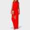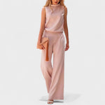 Bu takım, rahatlığı zarafetle buluşturarak gündüzden geceye her ana uyum sağlayan modern bir stil sunar. Kolsuz üst tasarımı ve dökümlü, bol paça pantolonlarıyla zamansız bir silüet yaratır. Hafif ve zarif duruşuyla, özel davetlerden günlük şıklığa kadar her ortamda dikkat çeker.