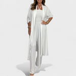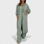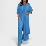Bu tulum ve ceket takımı, günlük hayatta hem rahatlık hem de zarafet arayan kadınlar için tasarlandı. Akıcı ve sofistike tasarımı sayesinde hafiflik ve modernlik sunar. Günlük şıklık için de, özel davetlerde daha özenli bir görünüm için de mükemmel bir seçimdir.
