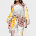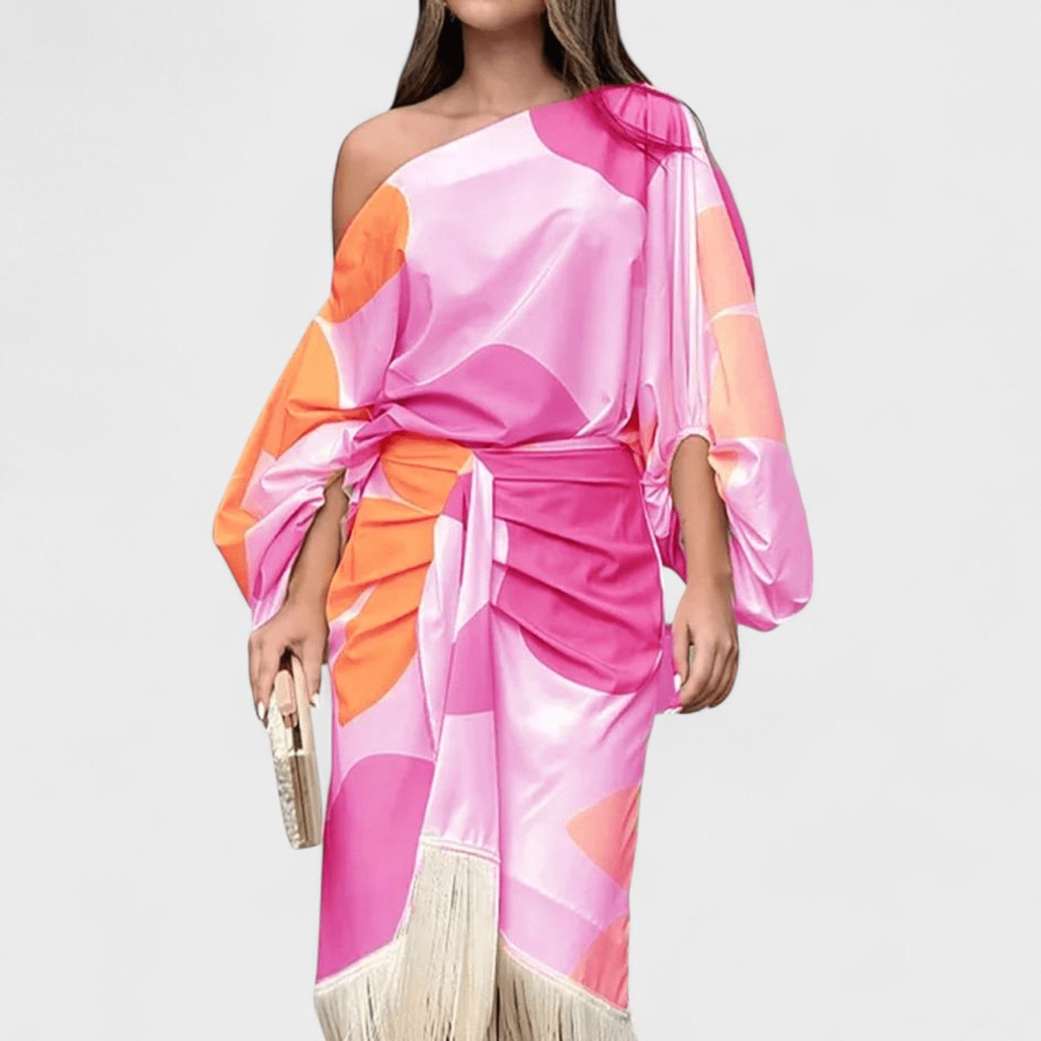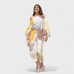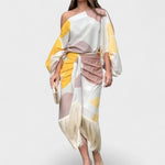Bu elbise, cesaret ile zarafeti mükemmel bir şekilde buluşturuyor. Asimetrik tasarımı ve hareketli detaylarıyla özgün bir hava katarken, bireyselliği ve şıklığı aynı anda ön plana çıkarır. Kendi tarzıyla öne çıkmayı sevenler için ideal bir seçimdir.
