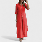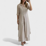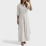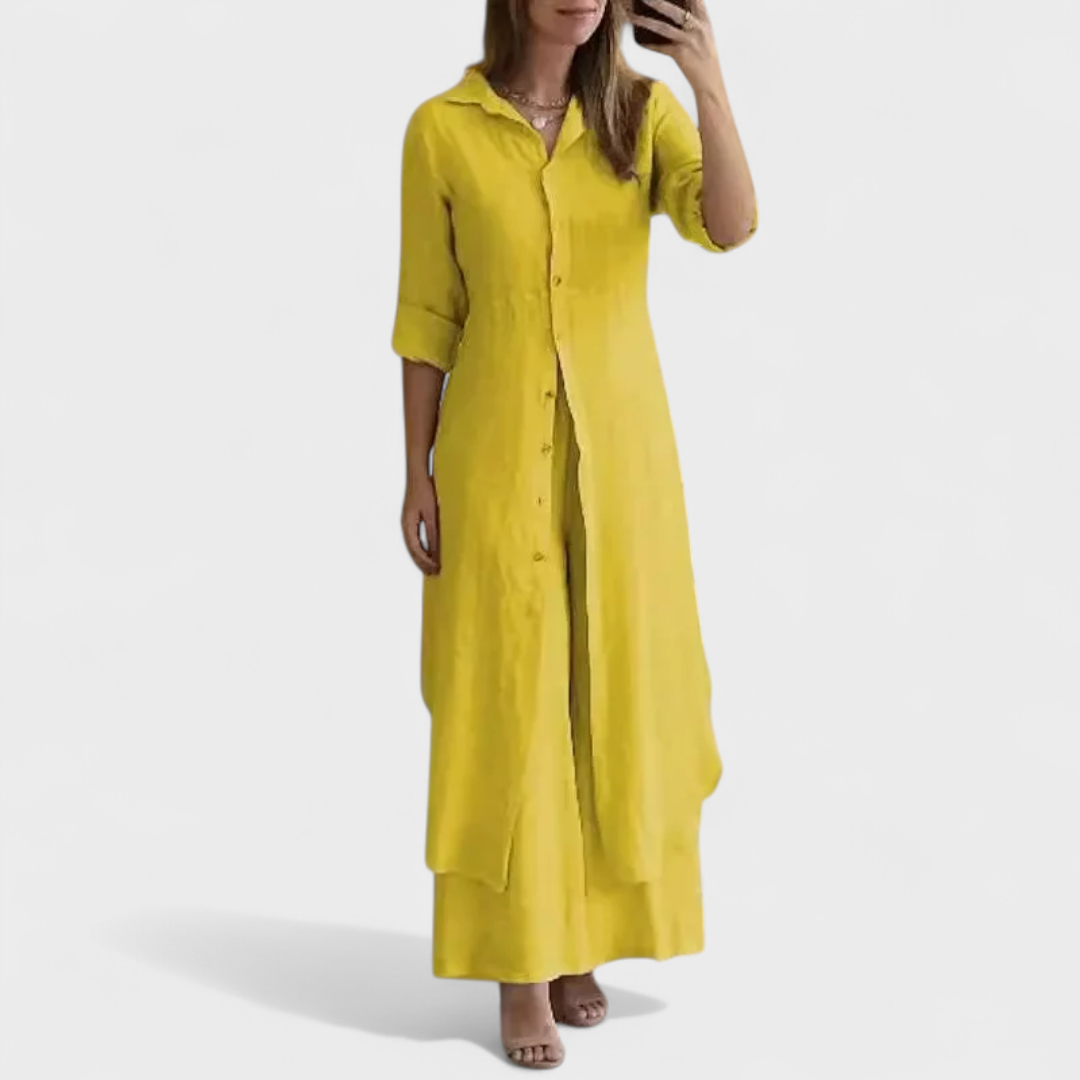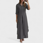 Bu takım, konfor ve şıklığı tek seçimde buluşturmak için tasarlandı. Akıcı kesime sahip gömlek ve uyumlu uzun pantolondan oluşan kombin, her durumda pratik ama sofistike bir stil sunar.
