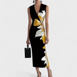 Bu elbise, feminen hatları sofistike bir şekilde vurgulamak için tasarlandı. V yaka detayı figürü uzatırken, vücuda oturan kesimi ve dikkat çekici deseni modern ve ayrıcalıklı bir hava katar.