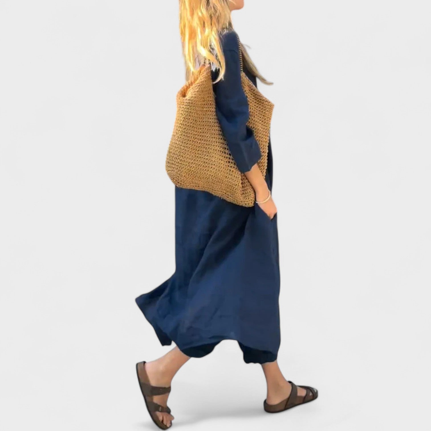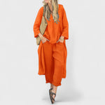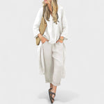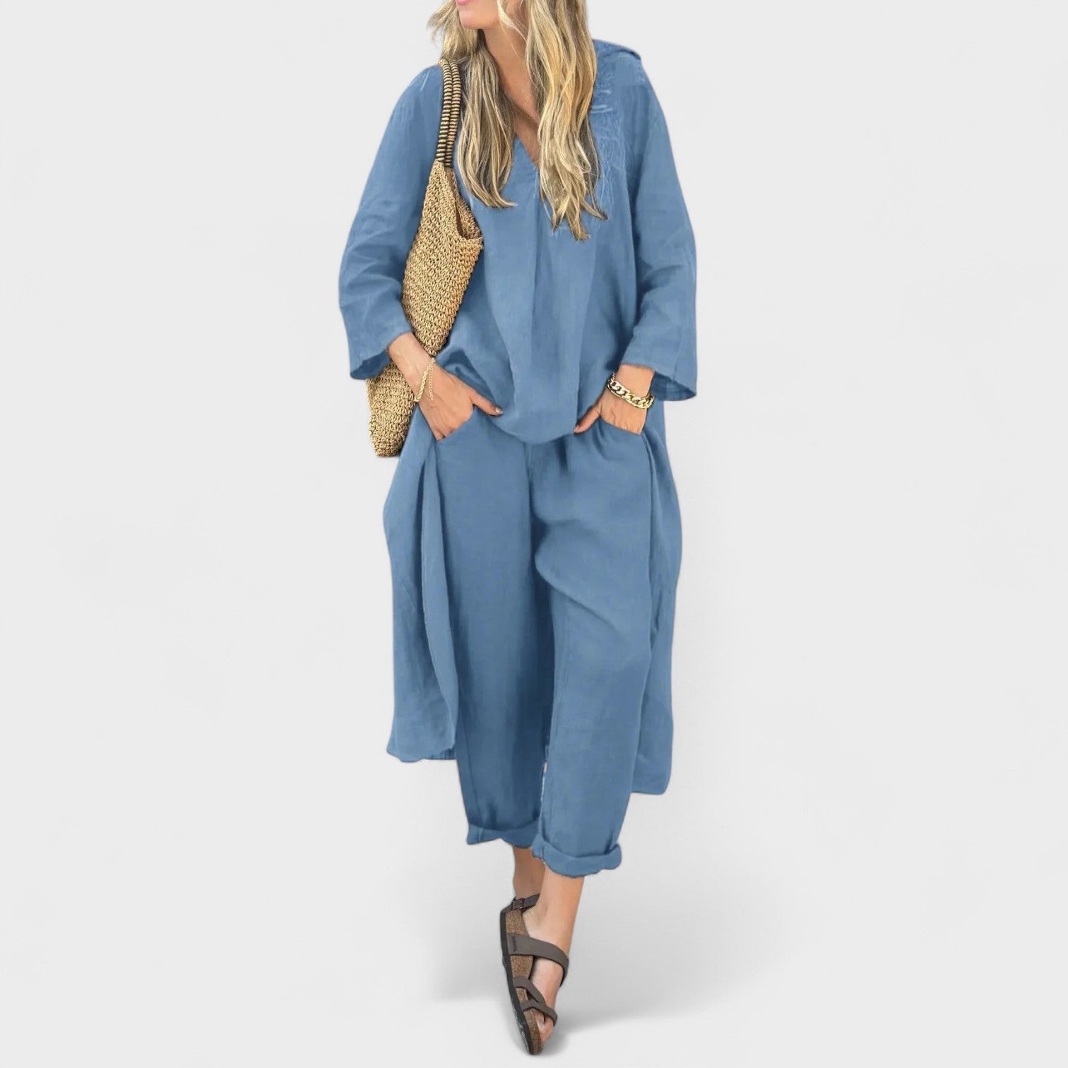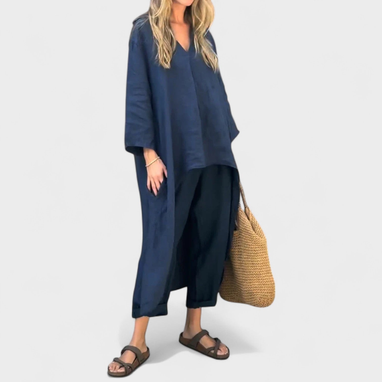 Este conjunto feminino une o conforto e o estilo com maestria. Composto por calças de corte solto e uma túnica longa de linho fluido, oferece um caimento leve e sofisticado. Ideal para os dias em que o bem-estar e a elegância precisam andar lado a lado.