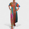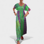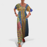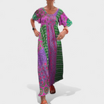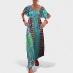 Bu uzun elbise; hafifliği, ferahlığı ve dikkat çekici rahat tarzıyla öne çıkıyor. Salaş ve akıcı kesimi özgürce hareket etmenizi sağlarken, yakasındaki ve desenlerindeki detaylar görünümünüze özgünlük ve zarafet katıyor.