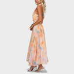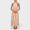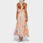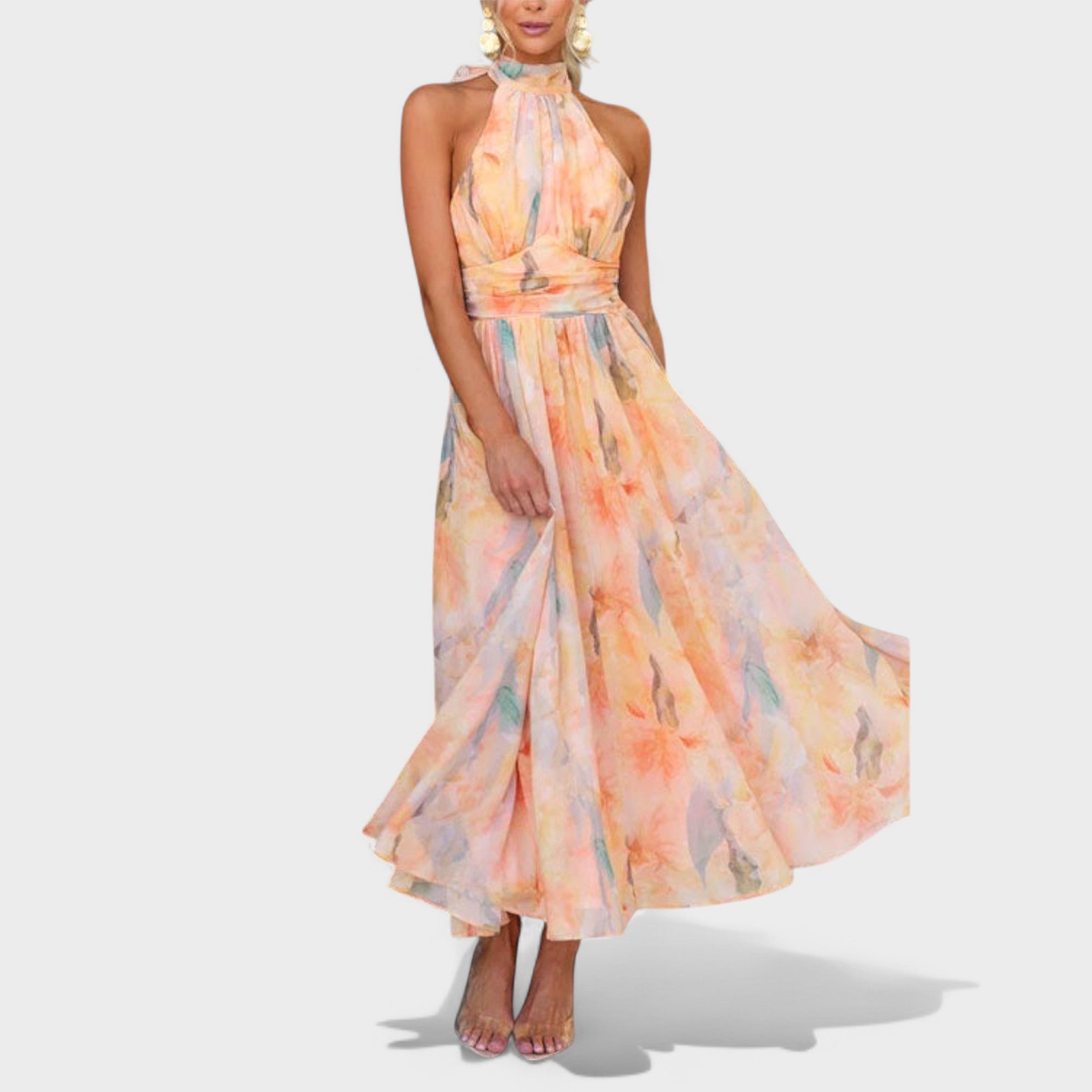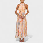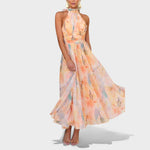 Bu uzun elbise, zarif kesimi ve kumaşının akıcı yapısıyla her adımda hafif ve zarif bir hareket sunar. Yüksek yaka ve kolsuz tasarımı, silueti sofistike bir şekilde vurgularken, bel kısmındaki detaylar feminen hatları ön plana çıkarır.