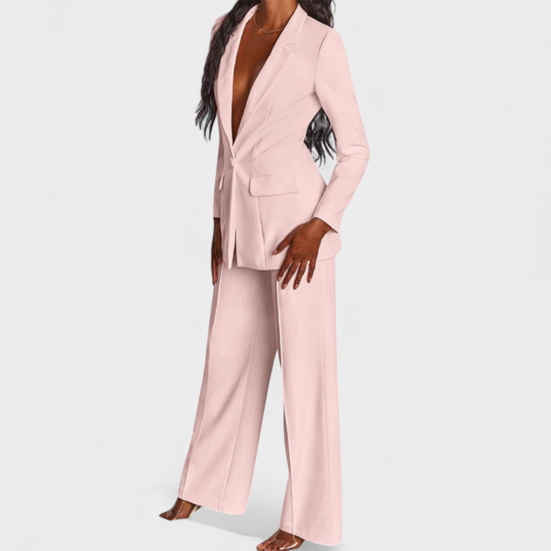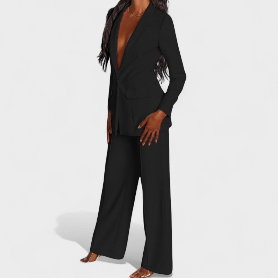 • Sofistike tasarım – bel vurgulu blazer ve silueti uzatan zarif pantolon kesimi.
