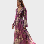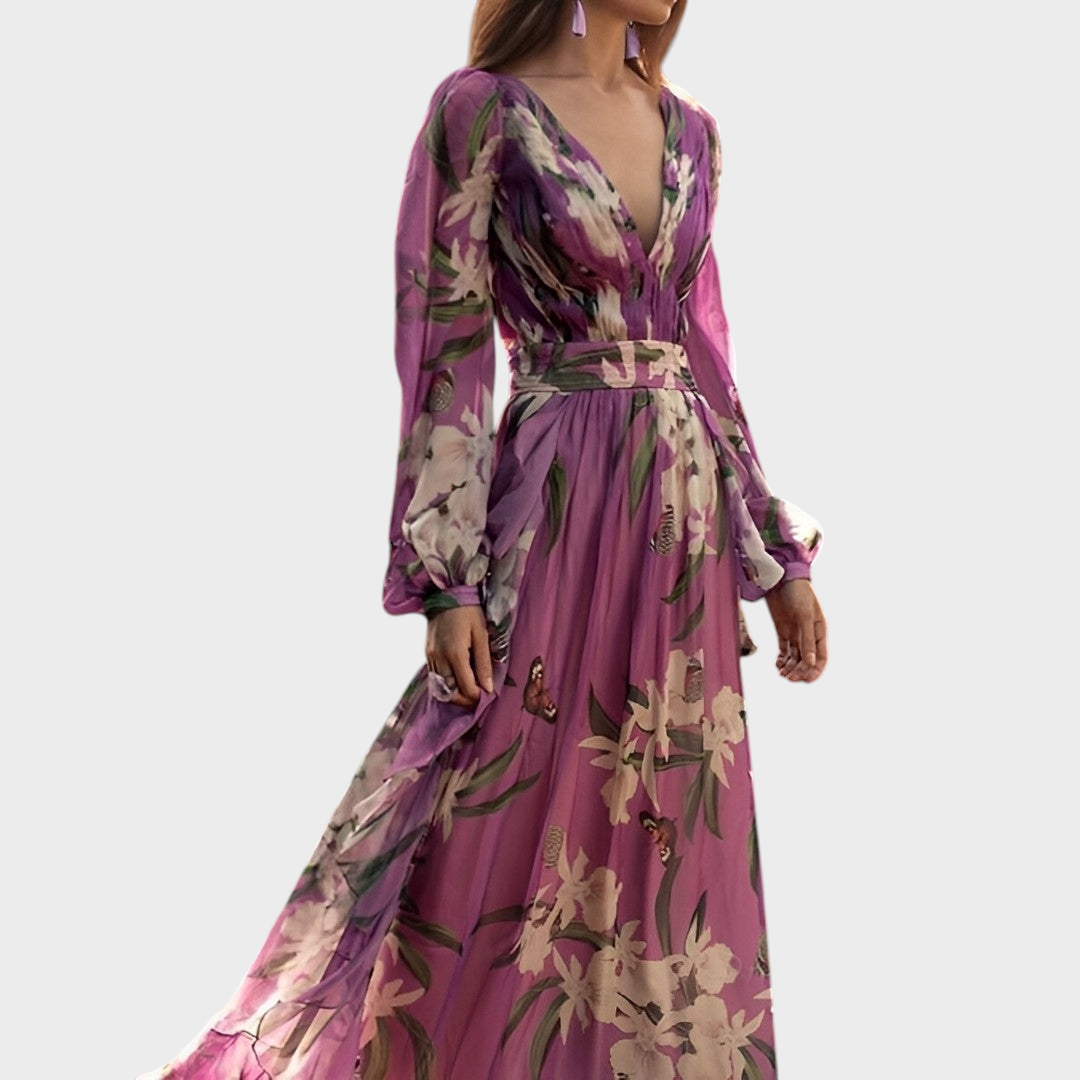 Bu uzun elbise, her detayında akışkanlık ve sofistike bir duruş sergiliyor. Derin dekoltesi ve zarif kolları, feminen bir denge yaratırken çiçek desenleri taze ve romantik bir hava katıyor.