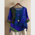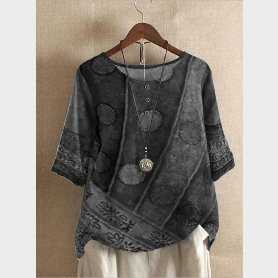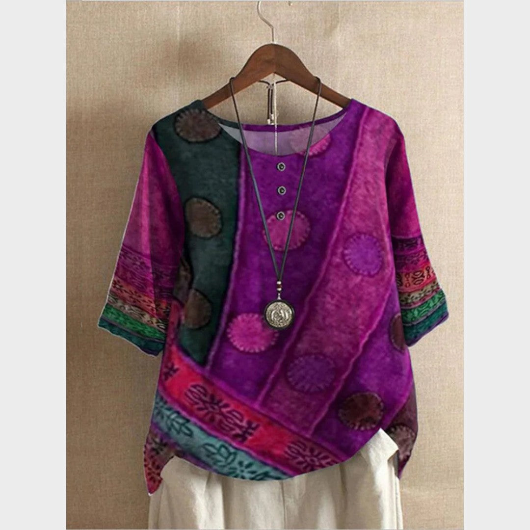 Etnik desenleri ve canlı motif karışımıyla bu bluz, özgün tarzını ön plana çıkarmak isteyenler için tasarlandı. Rahat kesimi ve düğmeli yakasıyla hafif, sanatsal ve karakter dolu bir görünüm sunar — kendine has stili olanlar için mükemmel bir seçim.